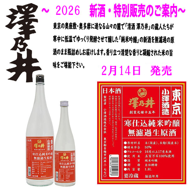2026年【販売店限定酒】2月14日発売 澤乃井 寒仕込純米吟醸無濾過生原酒